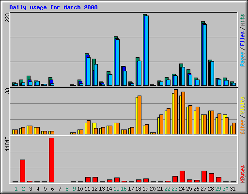 Day | Hits | Files | Pages | Visits | Sites | KBytes | ||||||